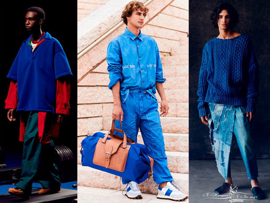 В тренде электрический синий. С детства мальчиков одевают в голубой цвет, поэтому одежда синего цвета есть в большинстве мужских гардеробов, но чаще всего это футболки. Приобретите синий спортивный костюм с худи, синий бомбер, худи или свитер.