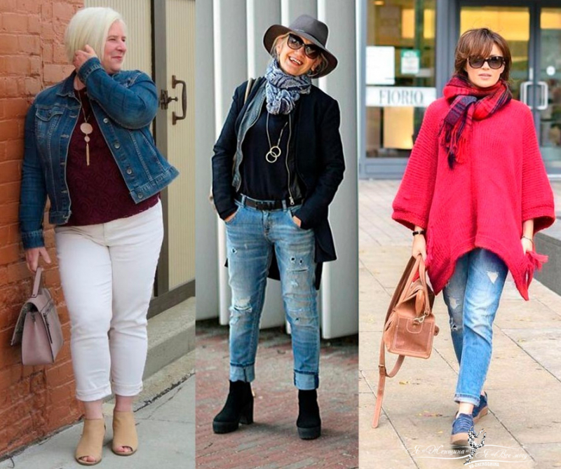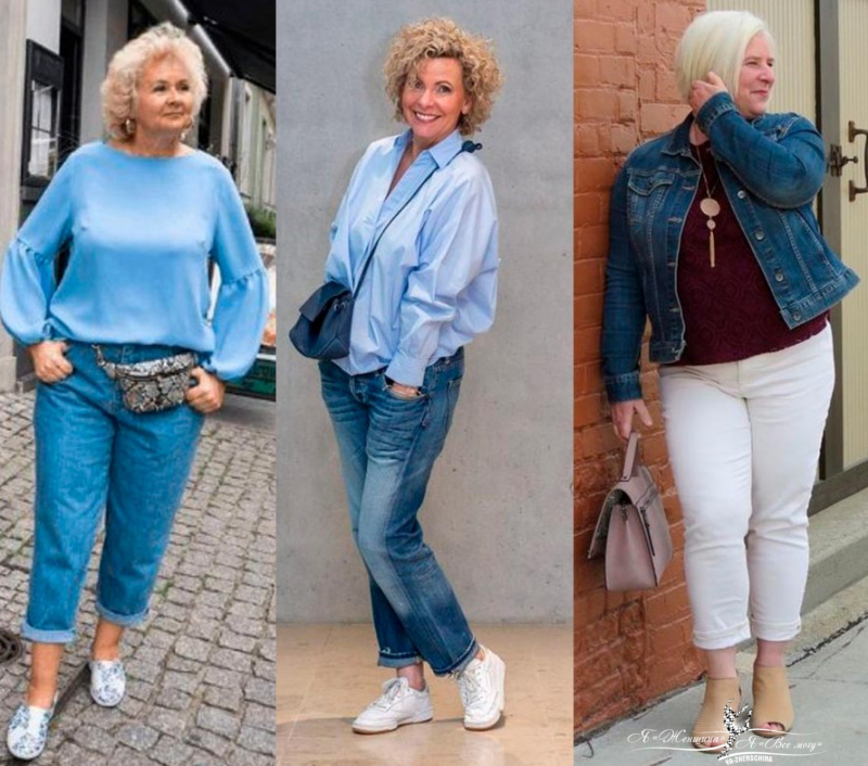 -  Белые джинсы. Женщинам размера 50+ не нужно бояться белого цвета. Просто прикрывайте паховую область и выбирайте модель не из тонкого денима.