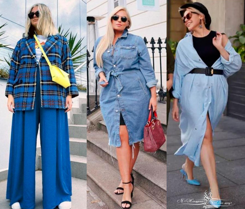 Голубой цвет освежает. Многие женщины не закрашивают седину, голубой идет блондинкам, а значит и женщине с седыми волосами подойдет. Платье-рубашка из плотного денима скроет недостатки полной фигуры.