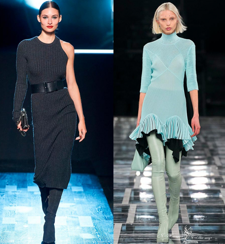 Трикотажные платья. Первое платье, на которое падает взгляд каждую осень. На показах были представлены платья длины мини с плиссированной юбкой в сочетании с удлиненными сапогами и цветными колготками. Такой вариант отлично подходит для девушек и энергичных женщин. Платья длины макси, напротив, подойдут более неторопливым и элегантным женщинам. В целом здесь нет никаких ограничений, ведь это вопрос комфорта. Ассиметричные модели подходят всем для любых выходов в свет: будь то клуб, свидание или спонтанная прогулка.