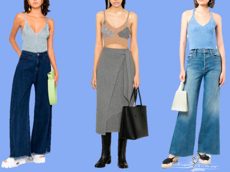 Вязаную майку миксуйте с расклешёнными от бедра джинсами.