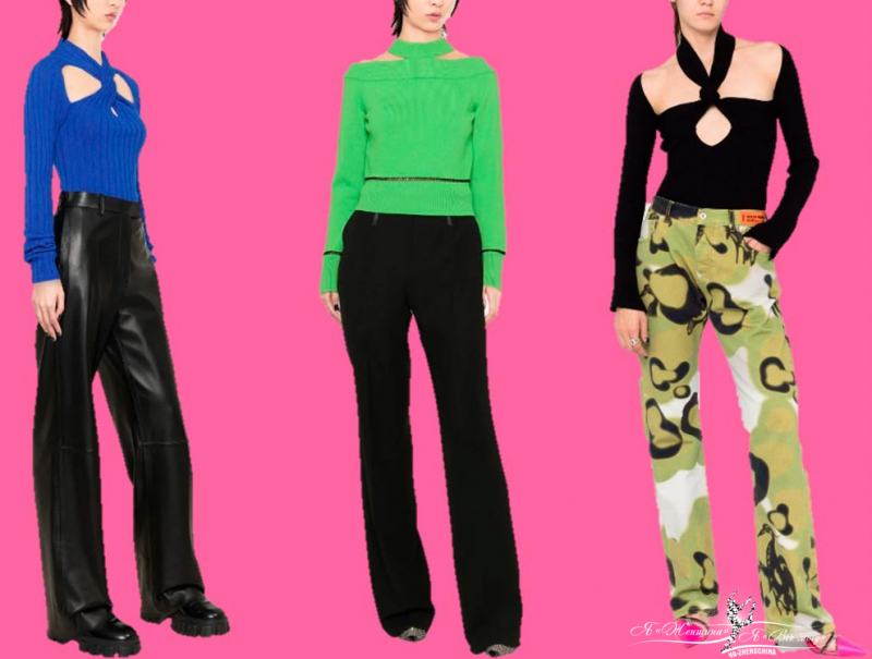 В тренде не только вырезы на трикотажных кофтах в неожиданных местах (на талии и спине), но и фигурное декольте.