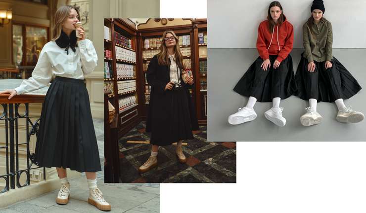 Такие юбки могут быть разными по фасону: узкие или широкие, стеганые или же со складками, как — например, у российского бренда Street Pie.