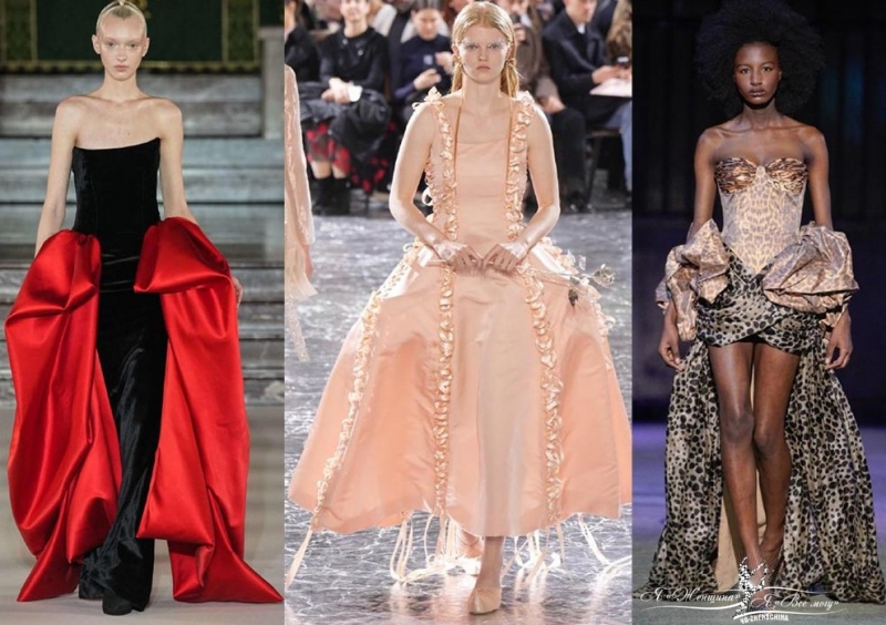 Какие тренды сразу обращают на себя внимание? Красивые складки на вечерних платьях, цветы, трогательные невесты в белых нарядах, девушки с крыльями, куклы и балерины. В этом сезоне образы больше похожи не на вечерние, а на сценические и театральные, отсюда пышные юбки, корсеты, коконы, расшитые красными кристаллами платья.