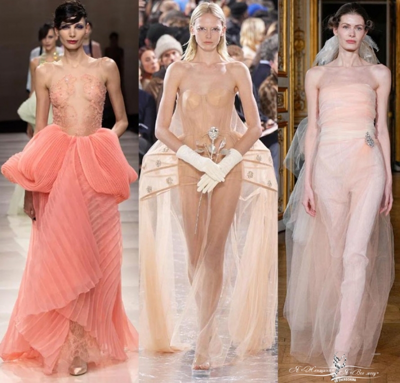 Голые платья в моде, но совсем не обязательно демонстрировать грудь, важно подобрать бежевый оттенок, который сливается с цветом кожи. Тенденция противоречива, потому что несколько брендов решили не останавливать на демонстрации груди и всячески намекали на первичные половые признаки. Скорее всего им хотелось привлечь внимание к своим коллекциям самым простым способом.