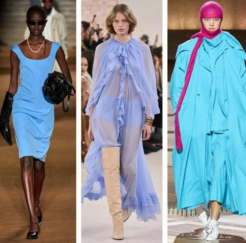 На какие стили при выборе голубого наряда обратить внимание? На деловой, выбирая лазурное платье-футляр. На воздушный стиль бохо с воланами и рюшами. На колор блок, сочетая голубой с фуксией.