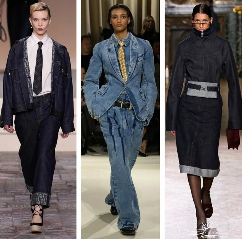В тренде не классические джинсы и куртка или юбка и рубашка, а джинсовые костюмы сложного кроя темно-синего цвета.