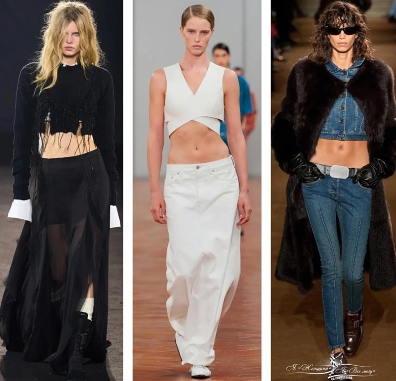 Тренд на открытый живот понятный, но не каждый должен стремиться его повторять. Низкая посадка визуально укорачивает ноги и удлиняет торс. Лучше для повторения тренда выбрать не брюки и джинсы, а длинную юбку на бедрах.