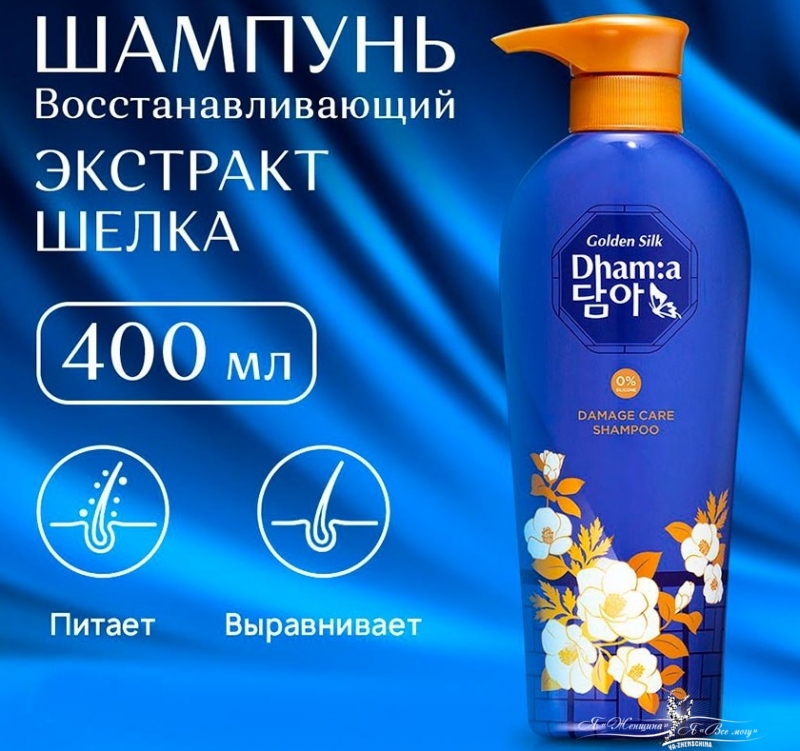 Шампунь от корейского косметического бренда DHAMA. В нем содержатся протеины жидкого шелка и растительных экстрактов бамбука, хризантемы, камелии и полыни. Эти компоненты проникают в структуру волос, восстанавливая и питая их по всей длине. Средство подходит для всех типов волос. Протеины шелка «запечатывают» поврежденные участки волос, увлажняют и питают их.