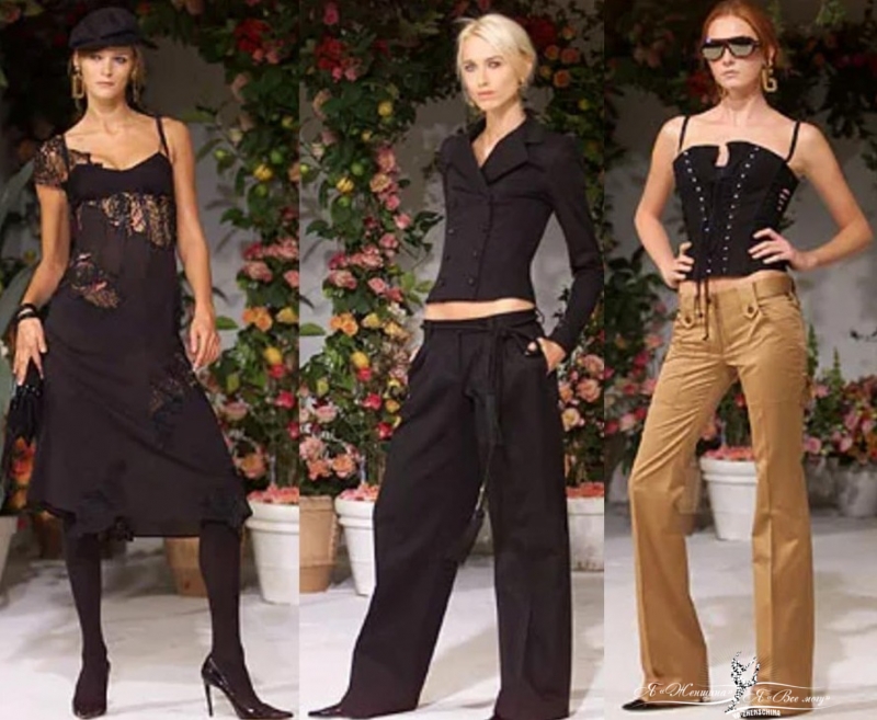Видим культовые корсеты, сексуальные комбинации и немного тропического принта, который позже будет повторяться в летних коллекциях бренда. Современным и сегодня можно считать образ с широкими брюками палаццо и коротким облегающим жакетом, такой силуэт самый трендовый в 2023.