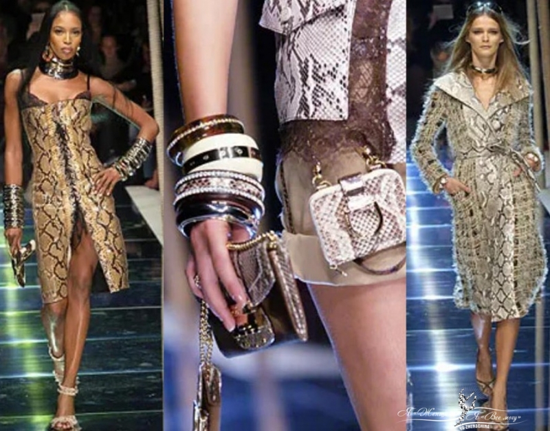 Во всей коллекции не было ни одного наряда, в котором не был бы задействован питон. Все началось с Наоми Кэмпбелл в корсетном платье в стиле рептилий, с металлическими украшениями, символизирующими Африку.