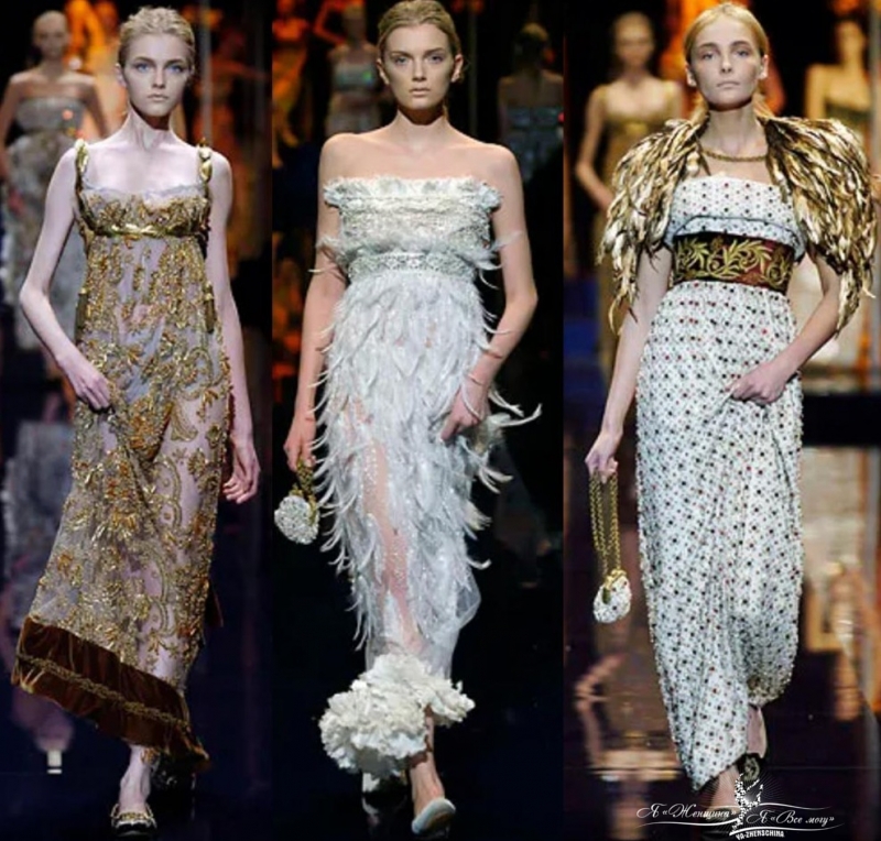 Потрясающий показ, переносящий в эпоху балов 1812 года. Игра мужского и женского, расцвет барокко, богатый бархат и старинное золото, роскошные накидки и рубашки с высоким воротником, платья с завышенной талией, линией ампир.