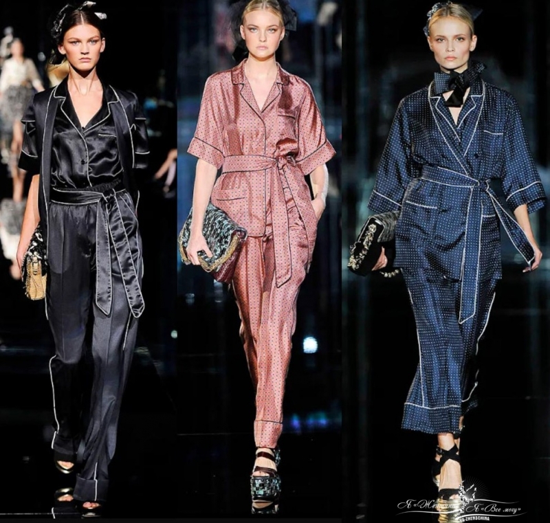 Шелковые пижамы, множество украшений в волосах моделей, юбки-пуфы, многоуровневые кружевные кардиганы, позолоченная парча.