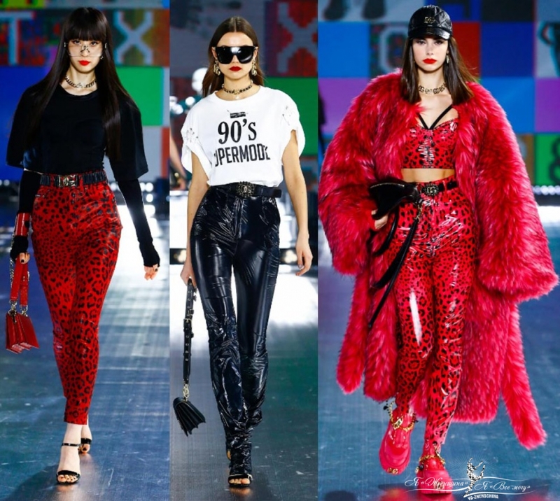 Черное нижнее бельё, дихотомия “хорошая” и “плохая девочка”, будуарные образы, леопардовый принт на белом поле, золотые короткие тренчи, высокие перчатки, гольфы, красный цвет, кропнутые куртки косухи.