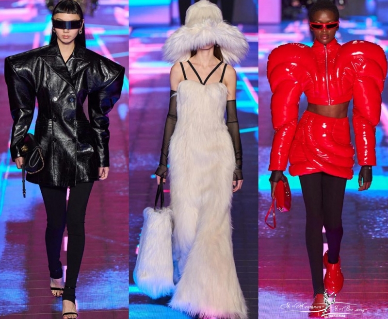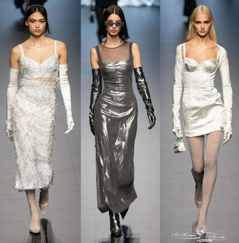 Панк-идея воплотилась в шнуровке крест-накрест, в атласных платьях с корсетом, бретелях и пряжках на брюках, пиджаке oversize, в массивных заклепках на кожаных куртках и сумках. На показе много серебра, которое отвечает за образы бренда в стиле футуризм.