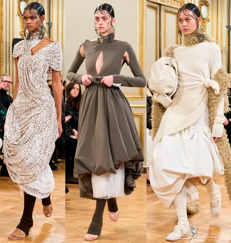 Или совершенно необычные и для многих неприемлемые модели от Rokh. Дизайнер акцентирует внимание на деконструкцию одежды. Он стремится, чтобы каждая его вещь не теряла актуальности спустя годы. Возможно ли это? Время покажет.