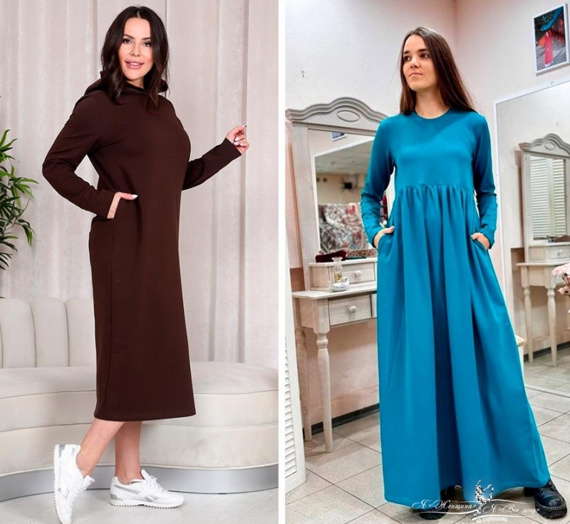Из футера вы найдете худи, свитшоты, толстовки, джоггеры, детские комбинезоны. А еще, хочется добавить, что изделия из футера великолепно сочетаются с изделиями из джинсы любого оттенка. Платья и юбки из двухниточного футера – идеальный выбор в прохладную погоду.