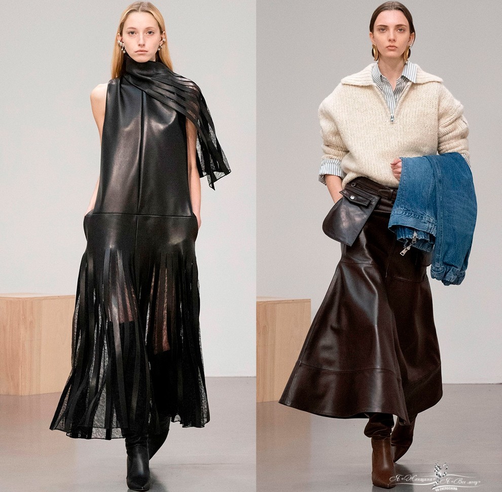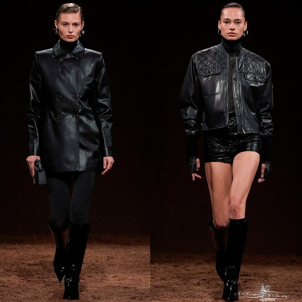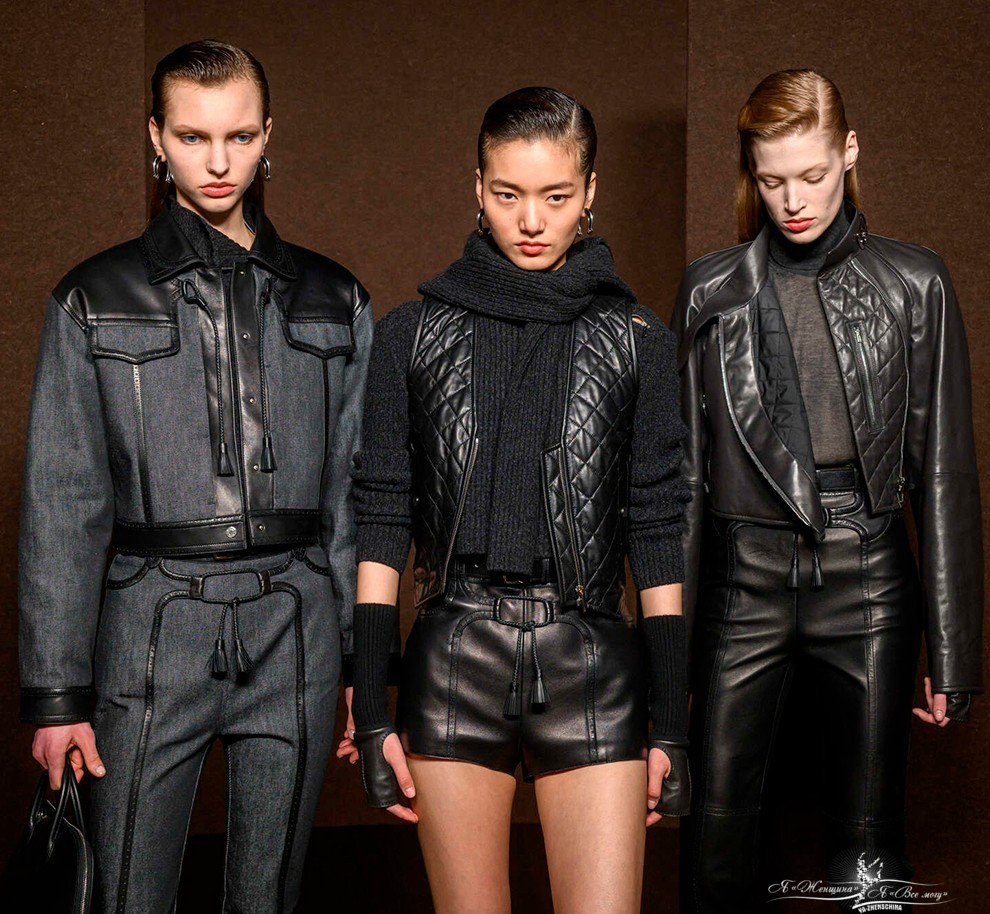 В коллекциях представлено богатство выбора, поэтому в сезоне 2025-2026 в моде любые предметы гардероба из кожи, от коротких шортов, топов и мини-юбок, до кожаных плащей длиной в пол и костюмов с юбкой или брюками.