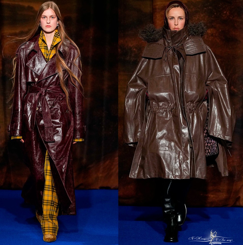 Коллекции осень-зима 2025-2026 предлагают множество самой разнообразной одежды из натуральной кожи различной выделки – гладкие, глянцевые, фактурные, зернистые и тисненые варианты. На равных в моде изделия из экокожи, которая по своим внешним характеристикам совсем неотличима от натуральной, а еще актуальны виниловые плащи, куртки и другая одежда.