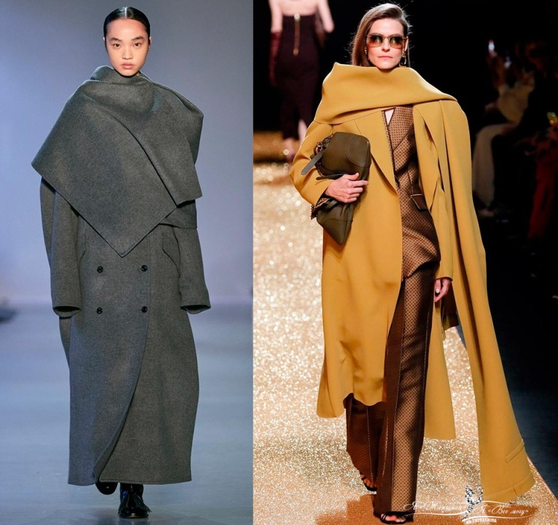 В новом сезоне будет популярным пальто, и лучше – в стиле оверсайз, а еще лучше, чтобы в дополнение к нему на плечах был широкий палантин из того же материала. Конечно, такая идея не подходит многим. Пальто и широкий палантин создает большой объем, а это возможно только высоким и стройным, визуально удлинит силуэт длинный шарф.