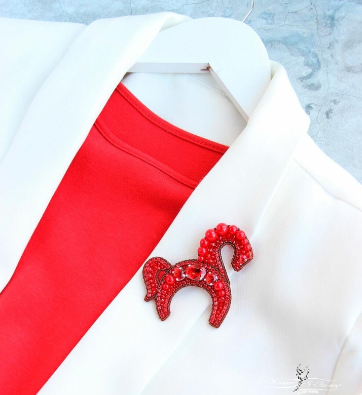 Огненно-красный цвет — воплощение стихии, страсти и смелости. Вся мощь и грация небесного скакуна застыла в призме ювелирной ручной вышивки. Каждая бусина, кристалл и пайетка пришиты вручную. Изысканность скрыта и в деталях: обратная сторона выполнена из мягкой экозамши и отделана мельчайшими итальянскими пайетками. Носите ее на лацкане пиджака, воротнике блузы или пальто — это ваш амулет на удачу, напоминающий о том, что любая цель достижима.