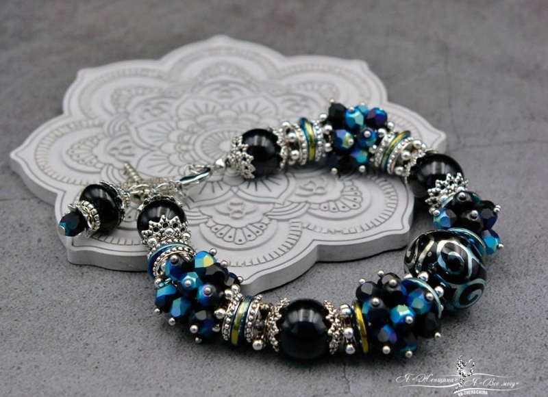 Он собран из минералов и стекла, а центральным элементом является крупная авторская бусина в технике лэмпворк. Глубина черного агата, искристая игра граненого чешского хрусталя с холодным голубым напылением и металлический блеск тонированного гематита создают многослойный, интеллектуальный образ с ноткой богемной роскоши. Удобная застежка с цепочкой-удлинителем и изящные подвески делают носку невероятно комфортной. Это аксессуар для тех, кто ценит историю в каждой детали. Идеально для вечернего образа с платьем-футляром, а также чтобы добавить глубины строгому total black.