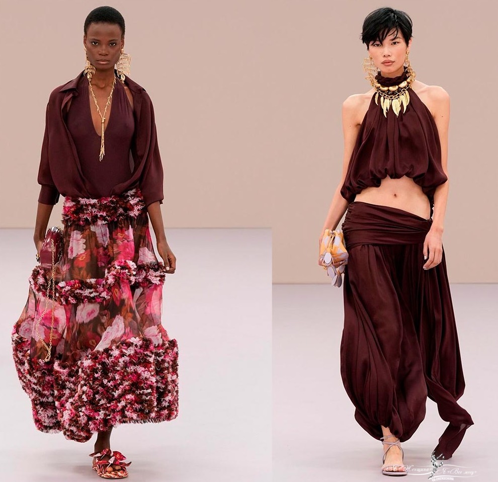 В новой коллекции 2026 немало денима, есть и одежда из кожи, но больше всего легких воздушных нарядов, в том числе с цветочными принтами. В некоторых образах цветы вплетены в юбки-кринолины, платья-парашюты и многослойные топы, благодаря этому создается эффект подвижности и реалистичности цветов, словно девушка сказочная нимфа, одетая в живые цветы самой природой.
