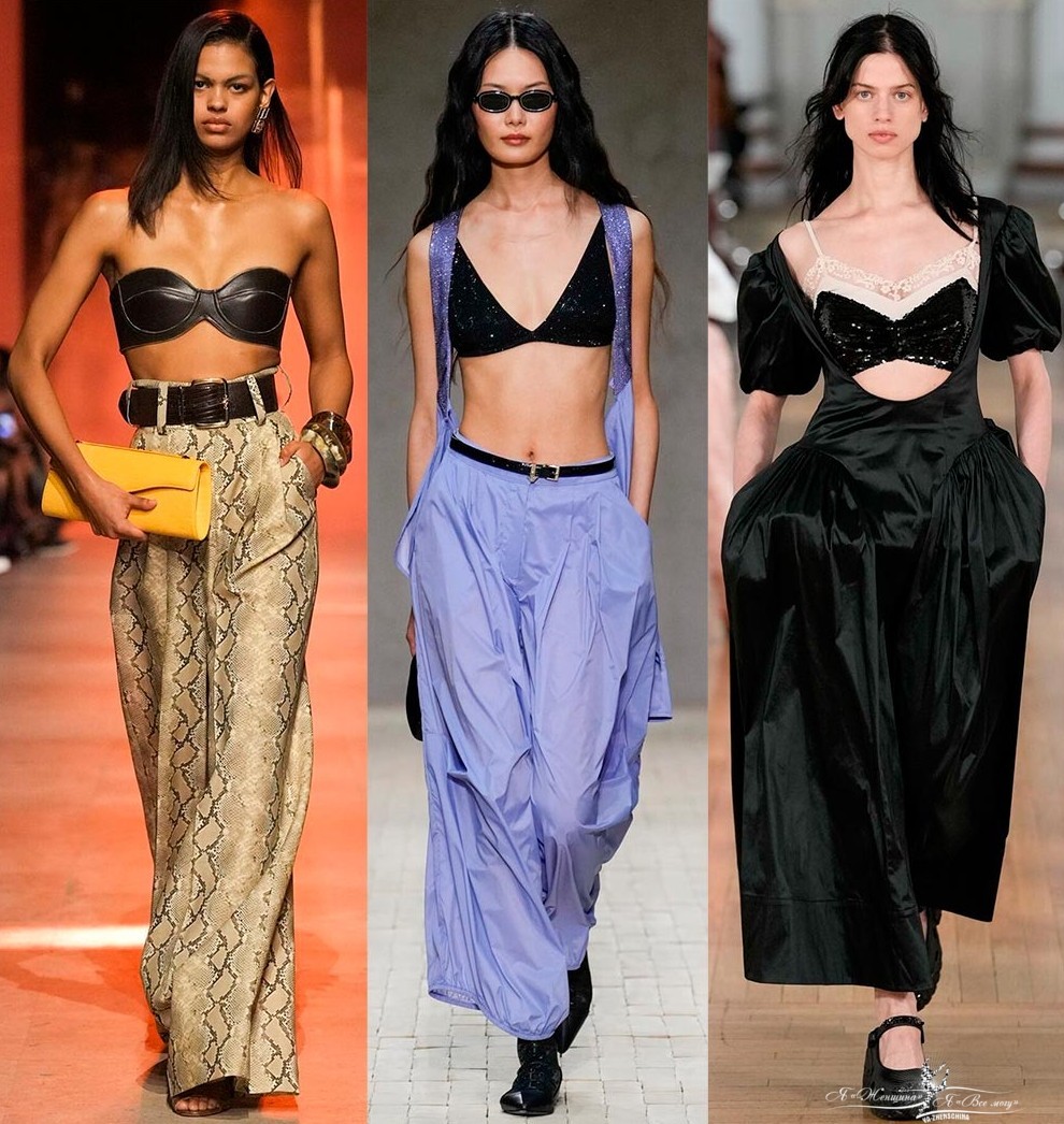 Помимо использования бюстгальтера как самостоятельного топа, есть еще варианты, в которых дизайнеры также делают акцент на тот же бюстгальтер. Это глубокий вырез, позволяющий продемонстрировать свое нижнее белье, но и здесь следует задуматься, ведь на подиуме можно все позволить, а на улицах города…