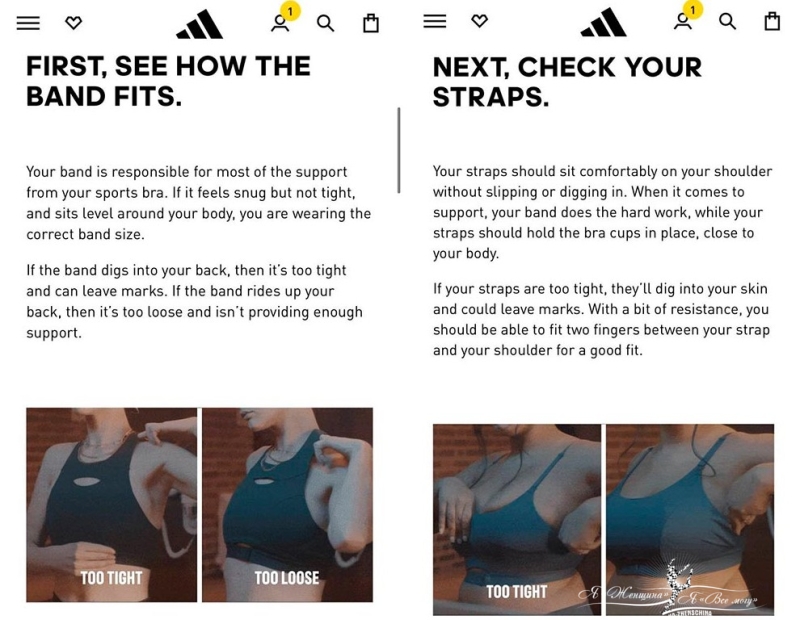 У adidas можно найти удобный туториал, где инструкции по выбору правильной посадки и размера бра сопровождаются наглядными анимированными изображениями. Правда, как и в случае с любыми мировыми брендами, весь текст на английском языке, что может быть удобно не каждому пользователю.