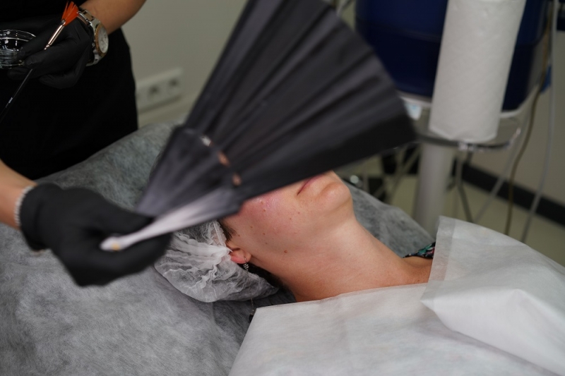 По результатам обследования и консультации, Анна Чайка назначила мне пилинг с гидрохиноном. Никакой особой подготовки к процедуре не требовалось, поэтому мы смогли начать в тот же день. Пилинг с гидрохиноном эффективно борется с гиперпигментацией и неоднородным цветом лица, а также запускает природный синтез коллагена. В ходе процедуры косметолог наносит средство мягкой кистью на кожу лица в несколько слоев. Специалист предупредила меня, что могут быть неприятные ощущения. В моем случае в ходе первой процедуры было весьма сильное жжение и покалывание, что свидетельствует об избыточной чувствительности кожи. И, кстати, эти ощущения практически сошли на нет в ходе последующих двух процедур, когда природный иммунитет кожи укрепился. В любом случае, снизить дискомфорт помогает косметический «девайс» – обыкновенный веер: потоки прохладного воздуха приятно освежают кожу.