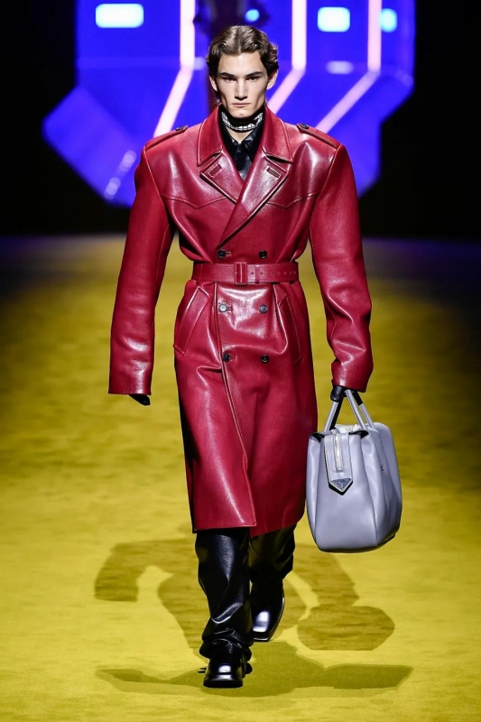 Первое, что бросается в глаза — обилие красок, текстур и слоев, свойственных коллекциям Рафа Симонса. От Миуччи в ней строгость линий, милитари-детали и эстетика аутдора. В этом симбиозе родились идеальные пальто в сочетании с нейлоновыми спортивными брюками, кожаные плащи с широкими плечами, образующие силуэт треугольника благодаря поясам, туго затянутым на талии, свободные комбинезоны, которые сочетались с водолазками и трикотажными чокерами, бомберы с меховыми манжетами и подолом, а также архивные аксессуары Prada — роботы для сумок, которые теперь стали серьгами.