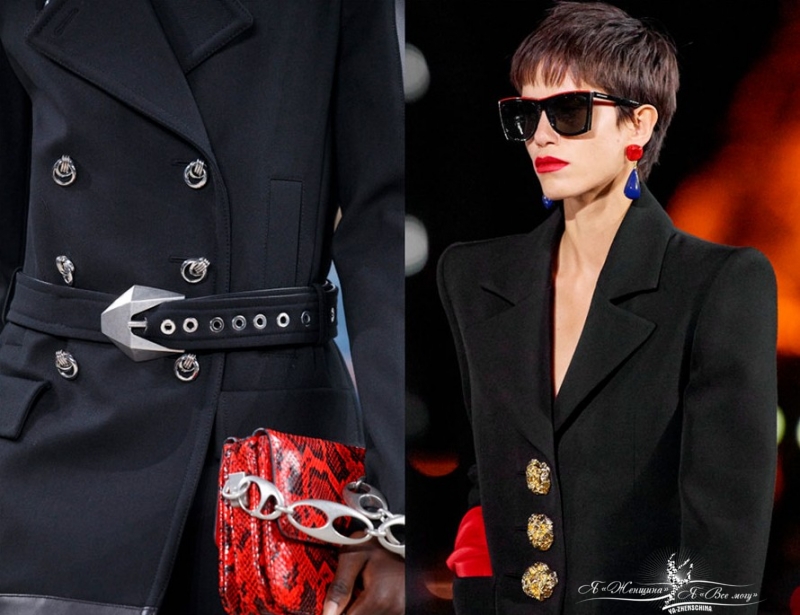 Пуговицы – самостоятельный аксессуар. Если у одежды крупные металлические пуговицы, то этого может быть достаточно, хотя стилисты брендов предлагают не останавливаться, а добавить в образ крупные серьги и акцентные сумки.