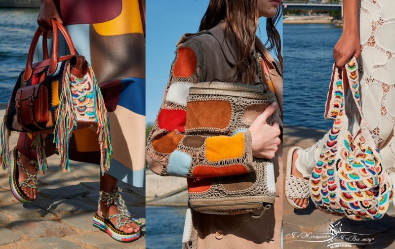 Заметили, как давно женщины не носили шейные платки на шее, так вот, в этом году их будут применять в создании образов по прямому назначению, не нужно больше выбирать: завязать платок на ногу или обмотать им сумку. Тема хендмейда особенно актуальна в сумках. Плетеные, вязаные, выкроенные из лоскутов ткани сумки в тренде.