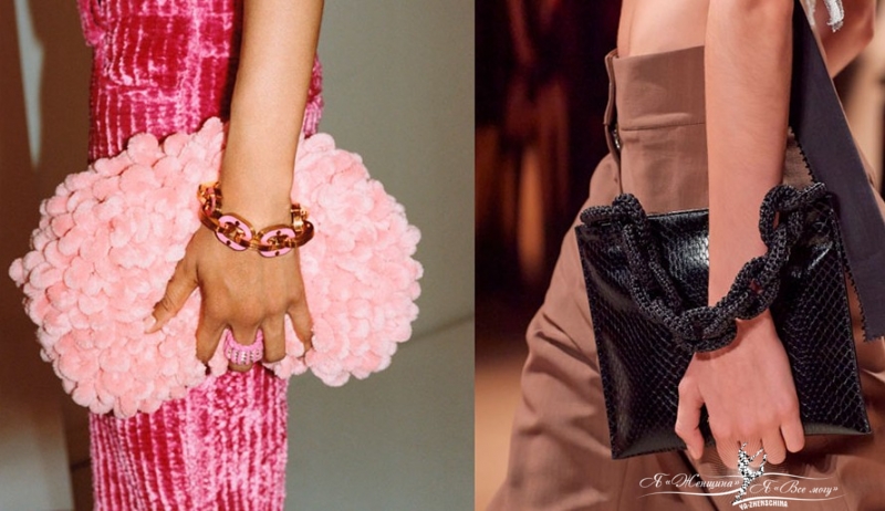 Оверсайз из верхней части перемещается вниз, но в портретной зоне гиперобъемными могут быть сережки. Цепи на показах фигурируют, но как ручки на сумках, как пояса на талии, а из портретной зоны они уходят. Одни сережки похожи на украшения ручной работы, другие – на бижутерию с рыночного прилавка.