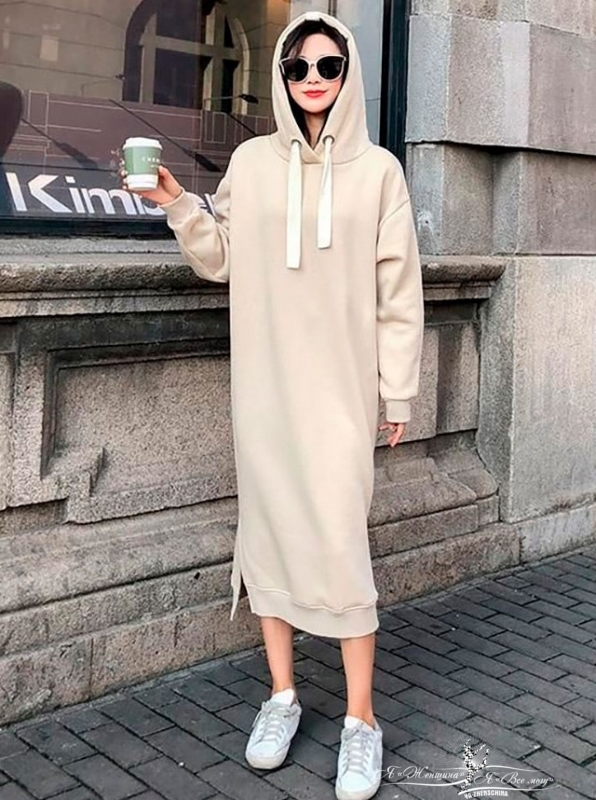 Все зависит от того, как мы хотим преподнести себя, надев платье с капюшоном, то есть, в зависимости от комбинируемых с ним элементов и деталей одежды, а также аксессуаров. Например, это платье можно надеть с джинсами, леггинсами, кроссовками или ботфортами (если платье короткое).